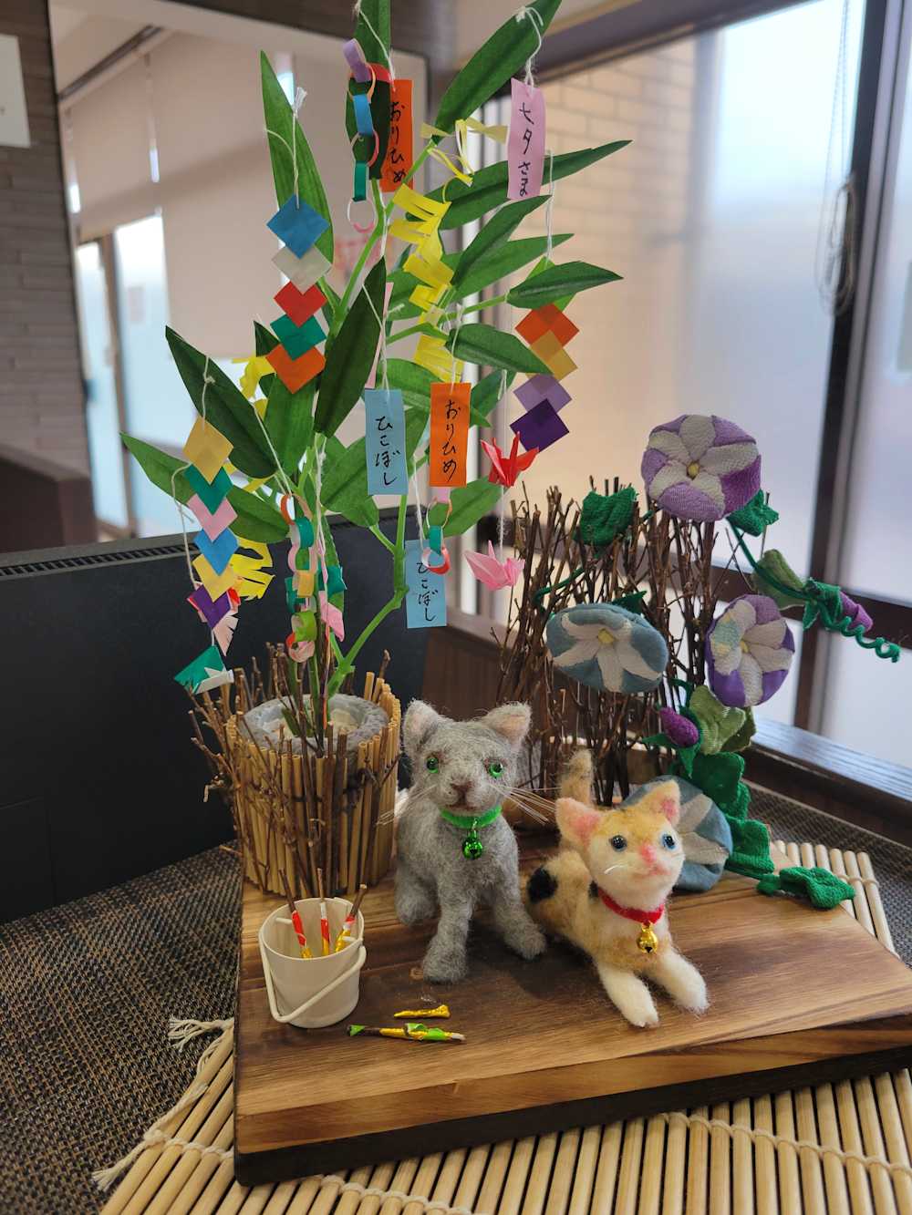 短冊や折り紙が揺れる笹の前には、可愛らしい猫たちが七夕の夜を楽しんでいる様子を表現しました。