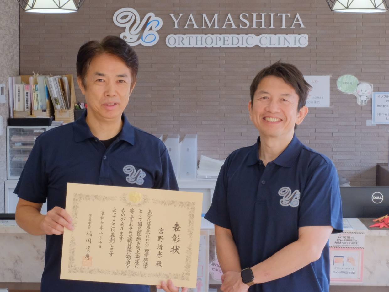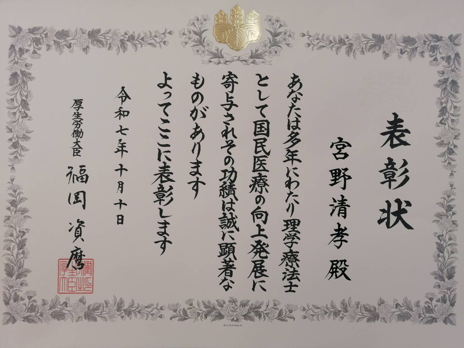 当院理学療法士チーフの宮野清孝が、理学療法士としての長年にわたる功績を讃えられ、「厚生労働大臣賞」 を受賞いたしました。