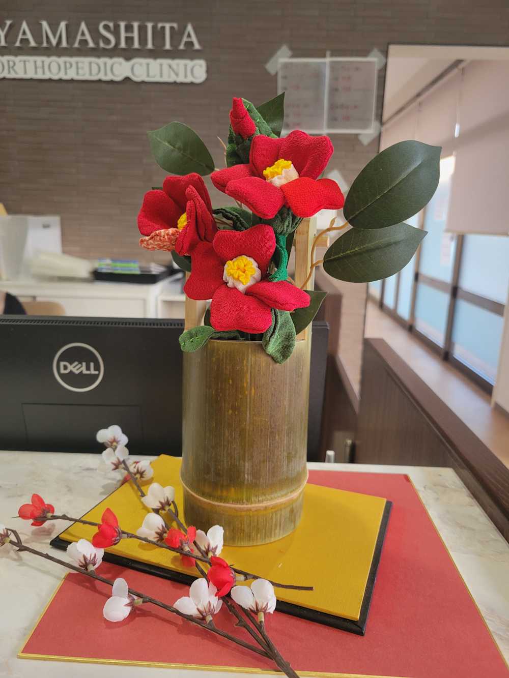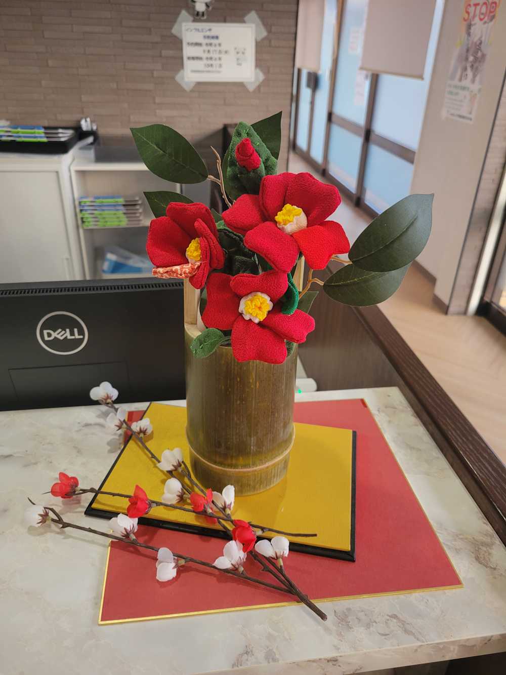 待合室には、手作りの竹筒花瓶に手作りの椿を飾っています。和の温もりと季節の彩りが、皆さまの心を和ませるひとときとなれば幸いです。