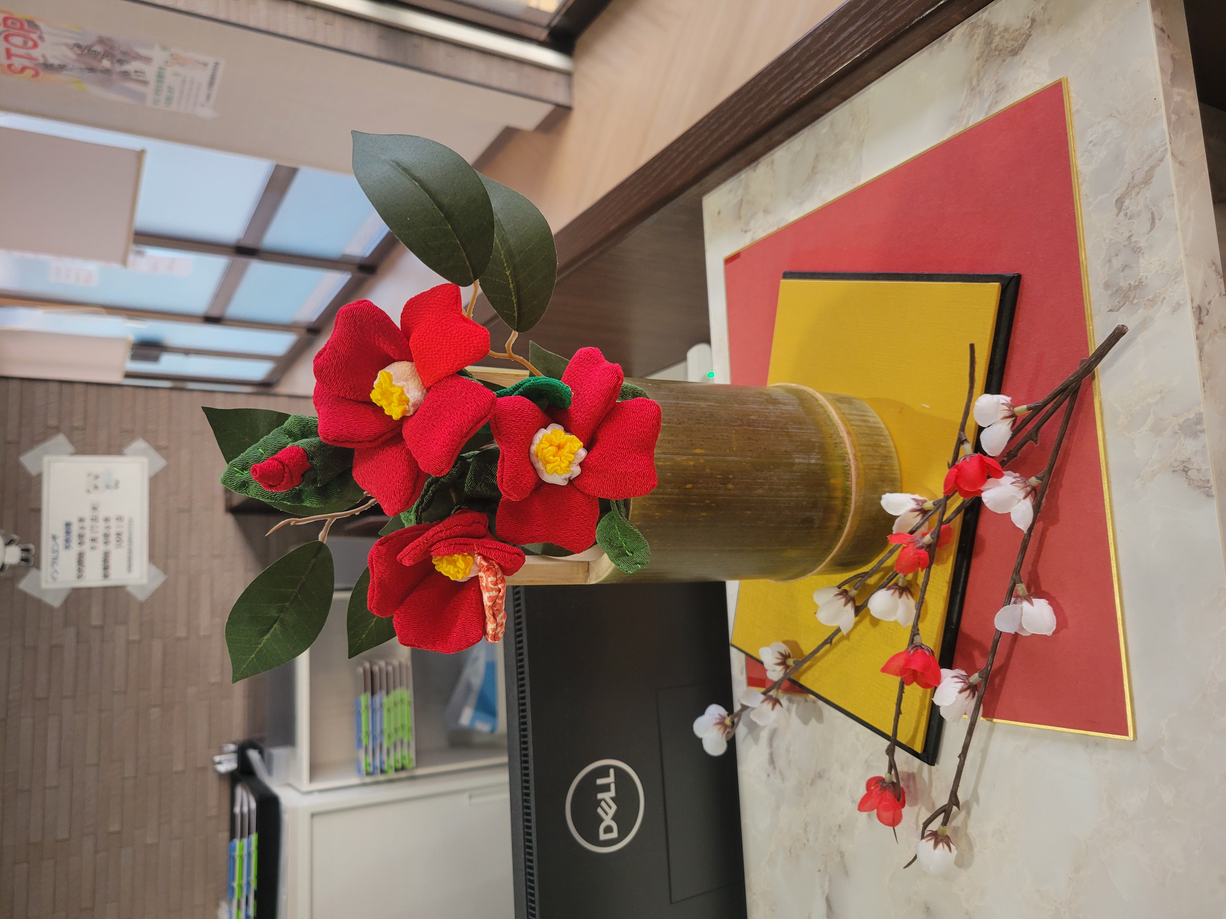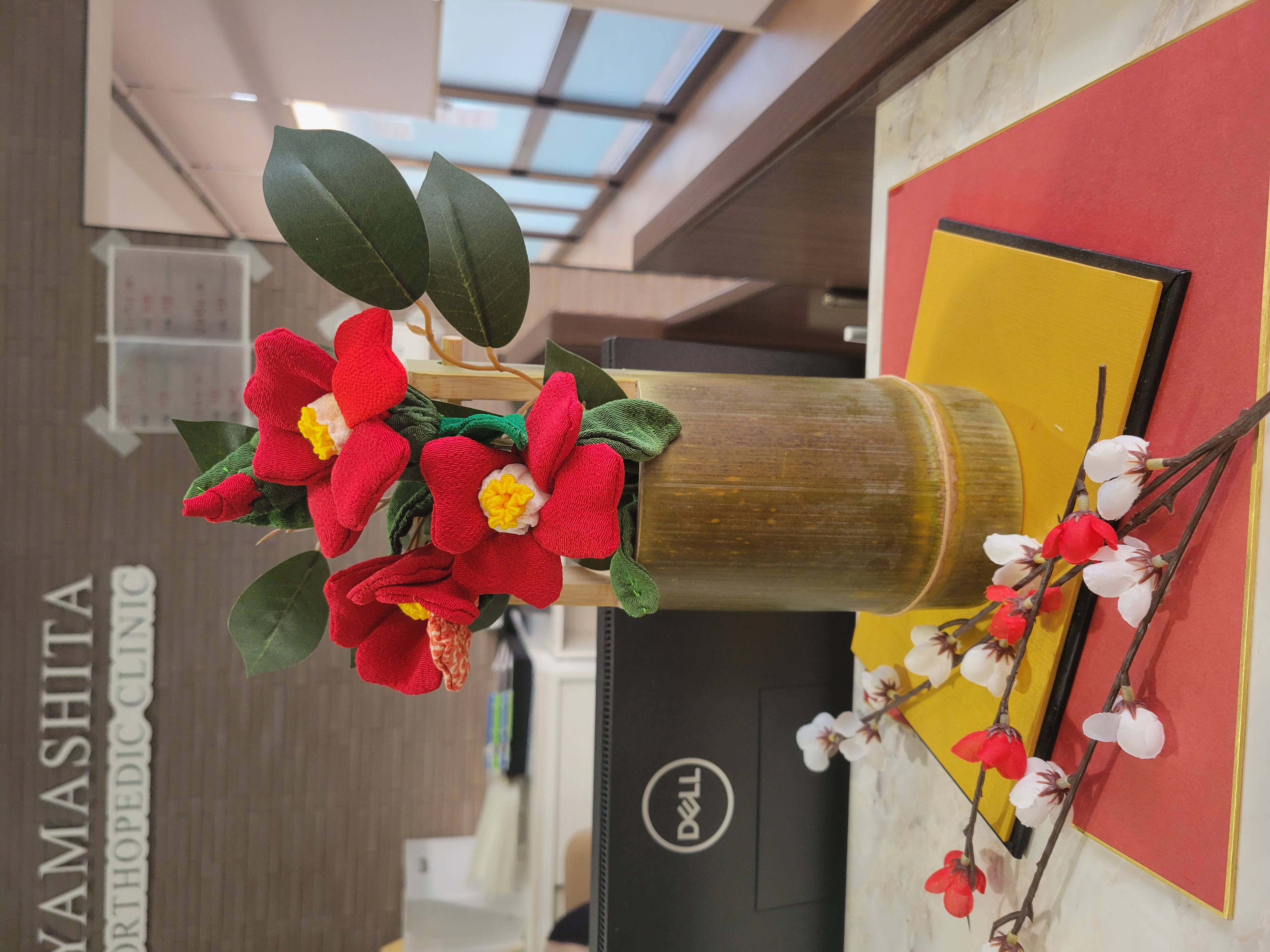 待合室には、手作りの竹筒花瓶に手作りの椿を飾っています。和の温もりと季節の彩りが、皆さまの心を和ませるひとときとなれば幸いです。