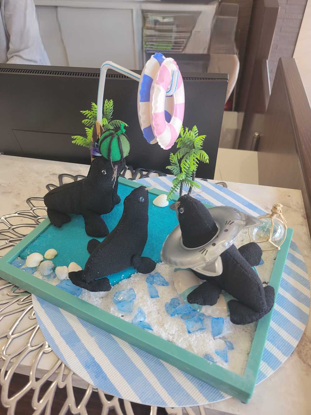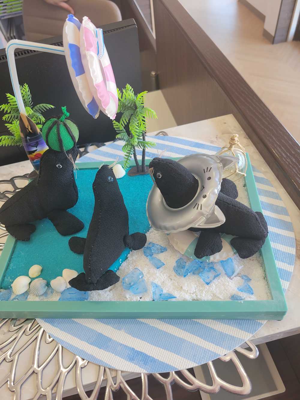 今回は、夏の涼を感じていただけるよう、海辺で遊ぶオットセイたちの飾り付けです。